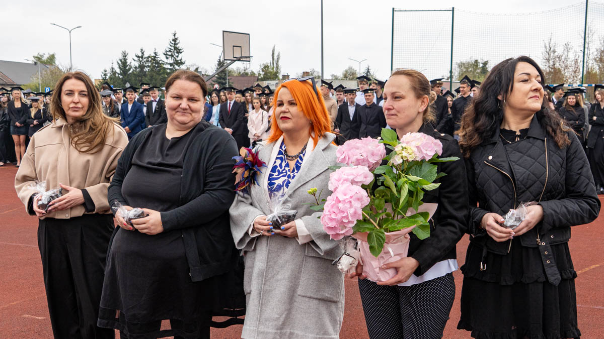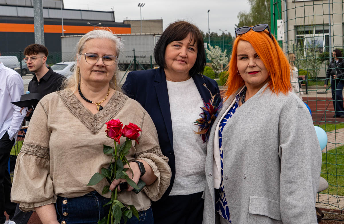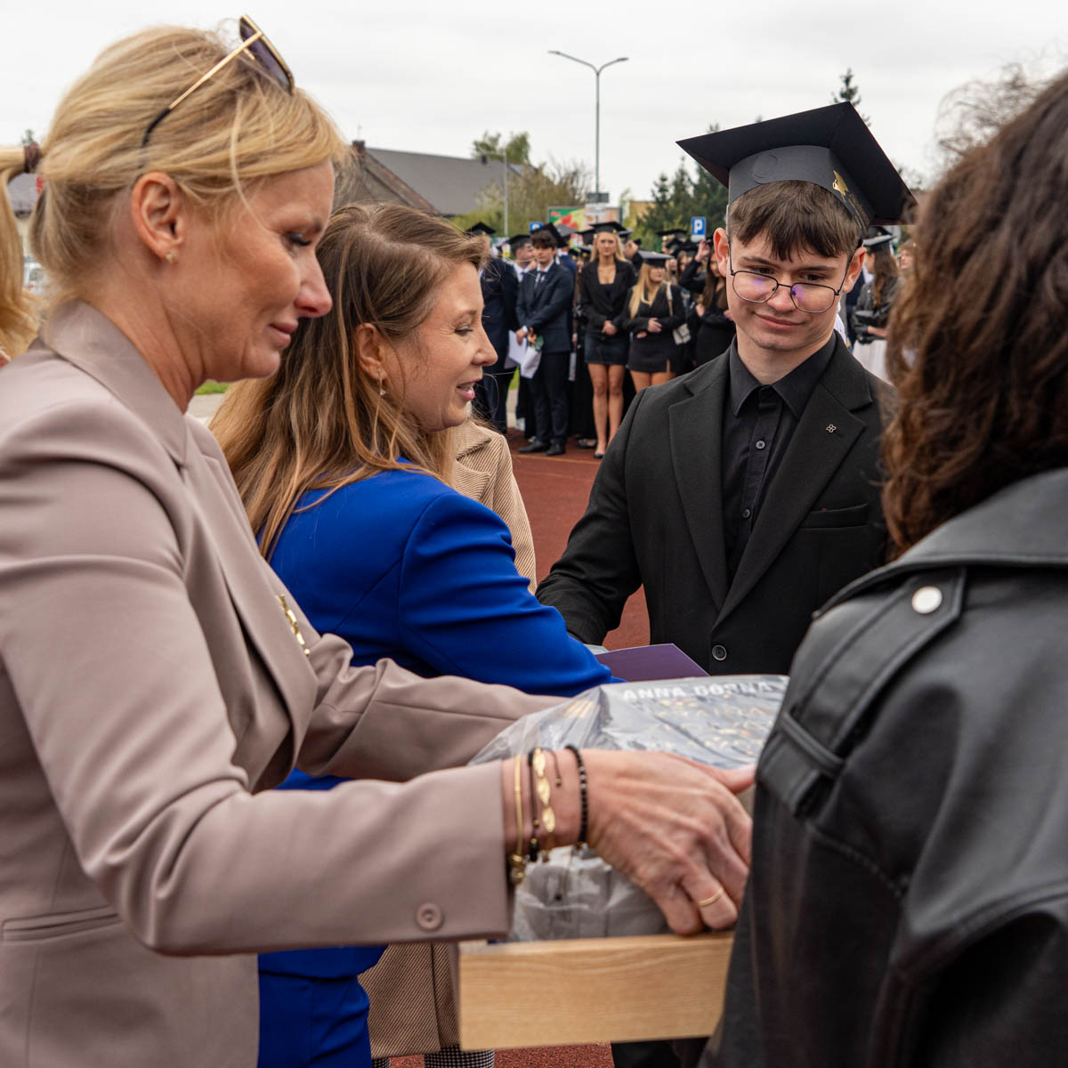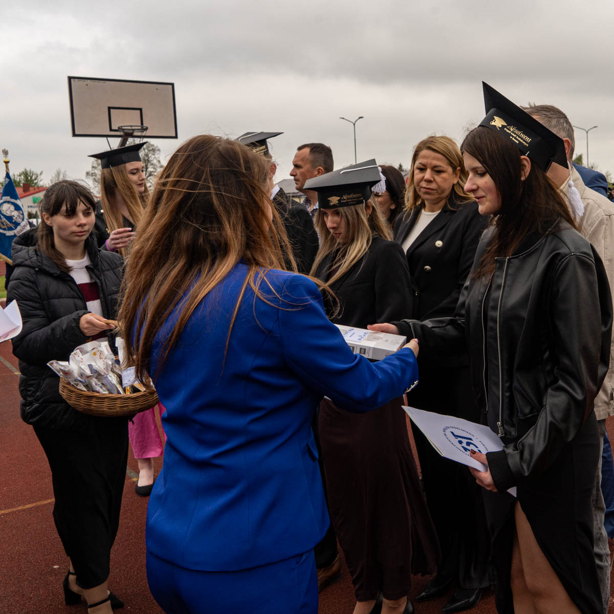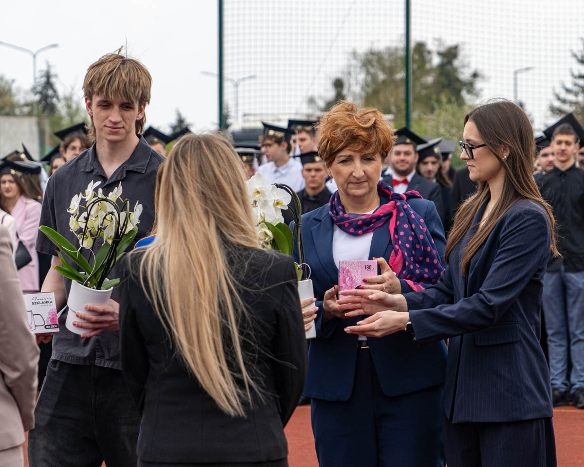Podczas ceremonii Pani Dyrektor Maria Bychawska pogratulowała absolwentom osiągniętych wyników w nauce, podkreślając ich zaangażowanie, wytrwałość oraz rozwój, jaki dokonał się na przestrzeni lat spędzonych w murach szkoły. W swoim wystąpieniu zwróciła uwagę, że społeczność szkolna to coś więcej niż tylko miejsce nauki – to wspólnota oparta na relacjach, wzajemnym wsparciu i szacunku.