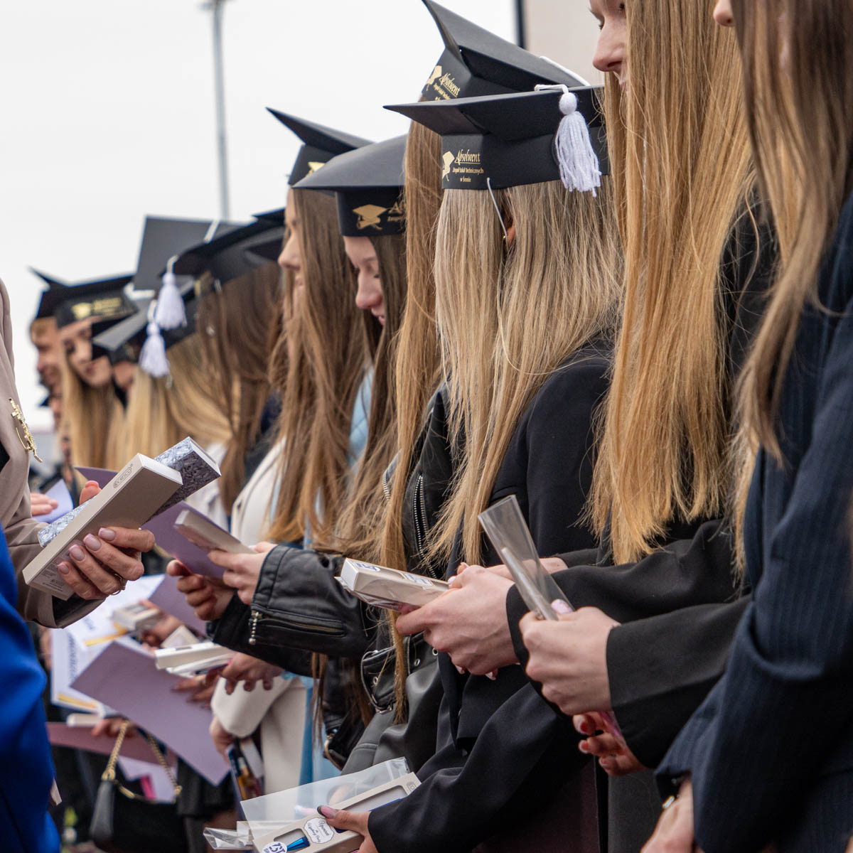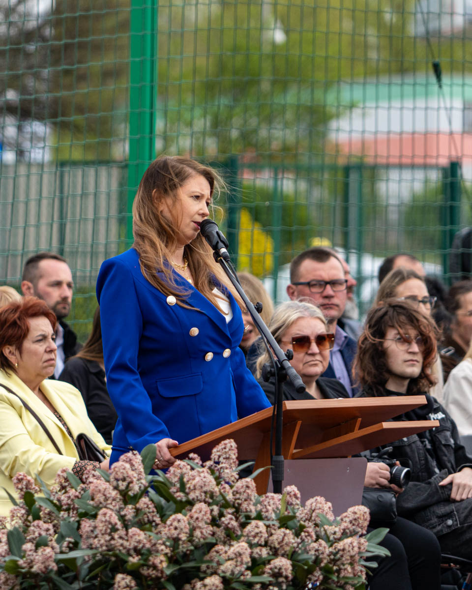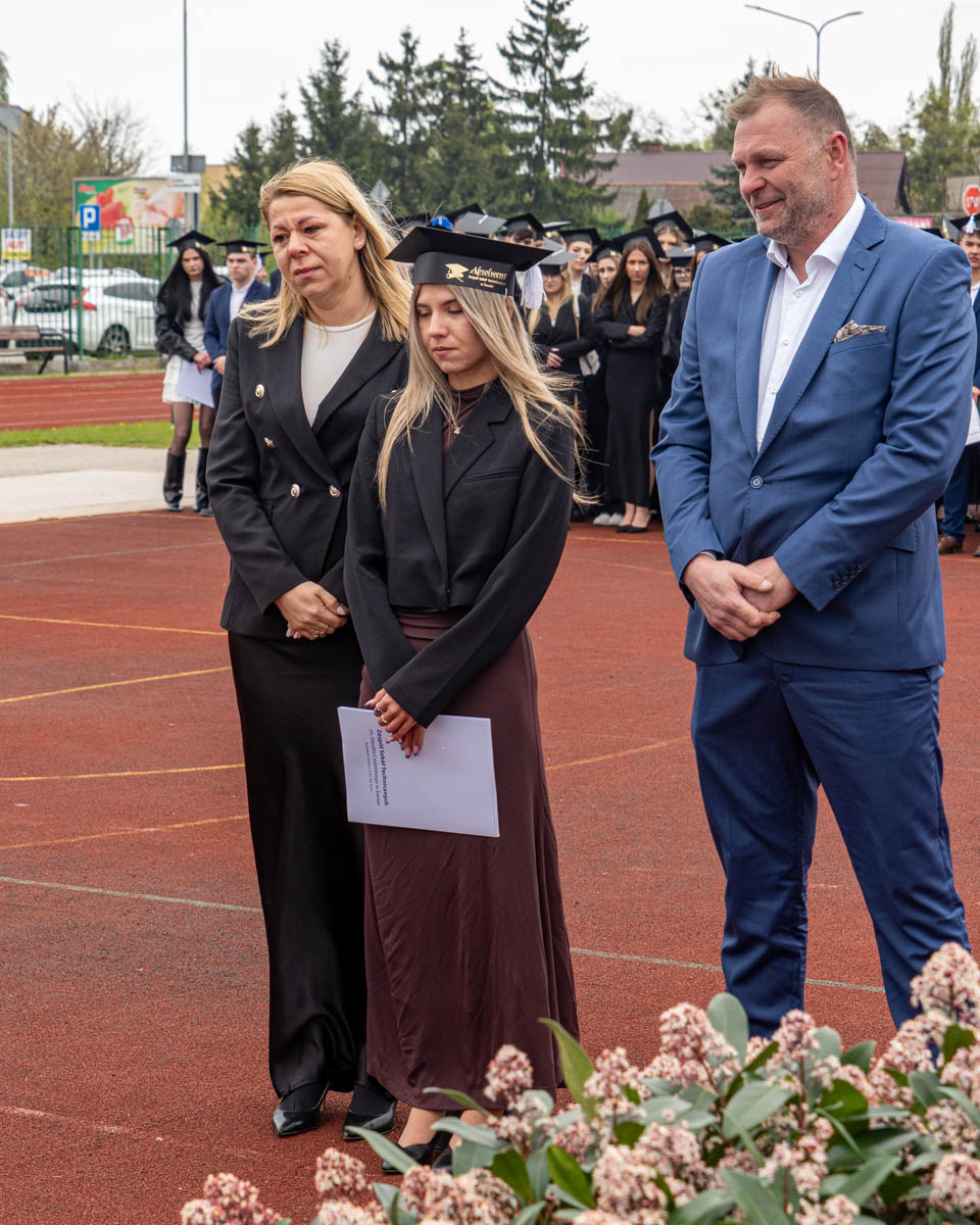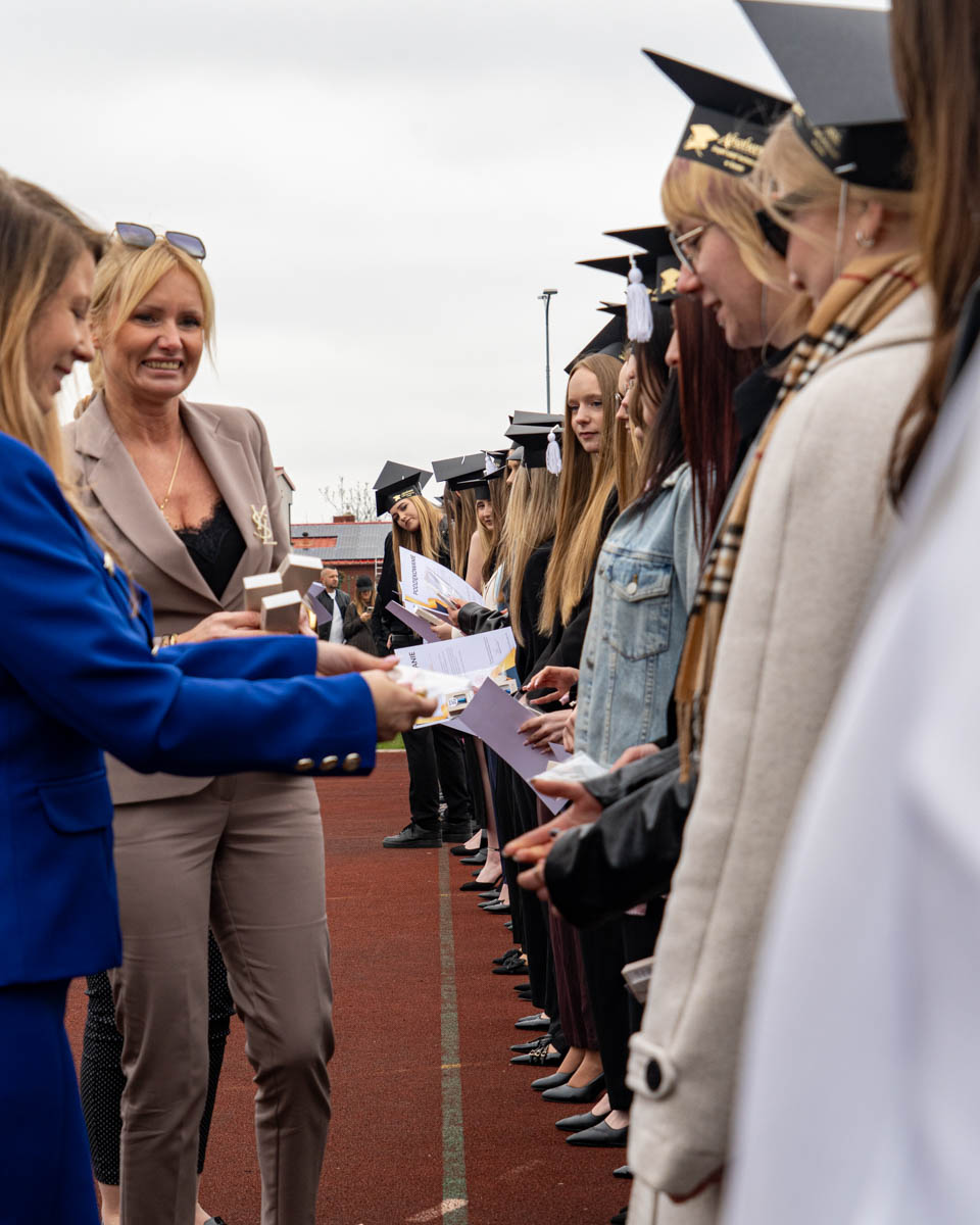 Podczas ceremonii Pani Dyrektor Maria Bychawska pogratulowała absolwentom osiągniętych wyników w nauce, podkreślając ich zaangażowanie, wytrwałość oraz rozwój, jaki dokonał się na przestrzeni lat spędzonych w murach szkoły. W swoim wystąpieniu zwróciła uwagę, że społeczność szkolna to coś więcej niż tylko miejsce nauki – to wspólnota oparta na relacjach, wzajemnym wsparciu i szacunku.