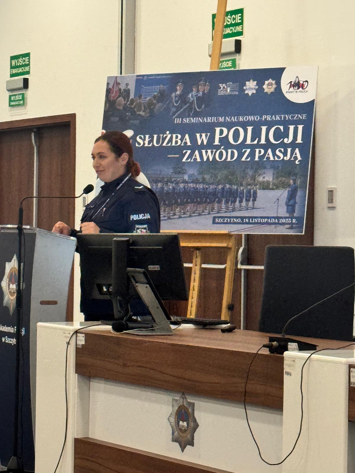 Wyjątkowym momentem było wystąpienie Melanii Rogali, absolwentki naszej szkoły, która obecnie pełni służbę w Komendzie Miejskiej Policji w Lesznie. Melania podzieliła się swoim osobistym doświadczeniem i opowiedziała o drodze do sukcesu – zarówno podczas nauki w Akademii, jak i w codziennej pracy w Policji. Jej historia była najlepszym dowodem na to, że determinacja i wiedza zdobyta w klasach policyjnych ZST Śrem są doskonałym fundamentem do budowania profesjonalnej kariery w mundurze.